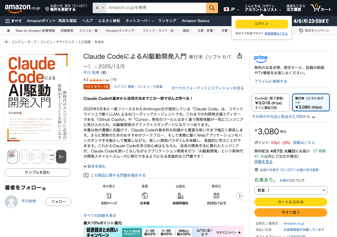 - 初心者が最初の1冊:Claude CodeによるAI駆動開発入門(技術評論社、3,080円)