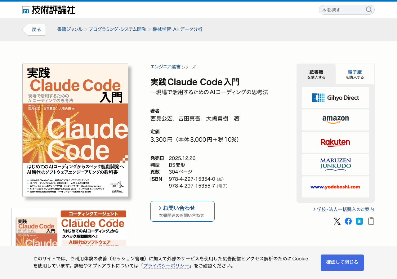 室谷続いて、総合的な完成度が一番高い本として評価されているのが『実践Claude Code入門』です。著者は西見公宏さん・吉田真吾さん・大嶋勇樹さんの3名共著で、技術評論社から2025年12月26日に発売されました。