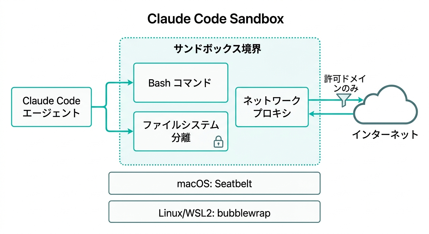 - macOSはすぐ使える(Seatbelt)。LinuxとWSL2はbubblewrap + socatのインストールが必要