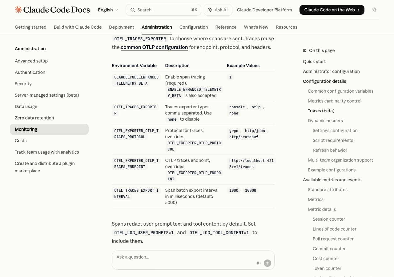OTEL_LOG_USER_PROMPTS=1はデフォルトで無効なのが正解で。プロンプトの内容が機密情報を含む場合があるので、有効にするかどうかは会社のポリシーに照らして判断が必要です。