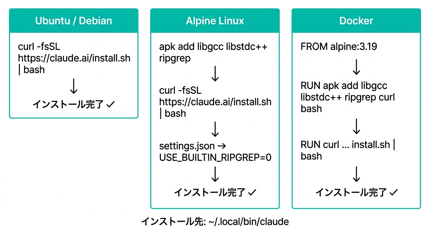室谷Claude CodeのLinuxインストール、整理しておきましょう。Ubuntu/Debianはネイティブインストーラー一行で完結、Alpine Linuxは依存パッケージを入れてからという手順の違いが最重要ポイントです。