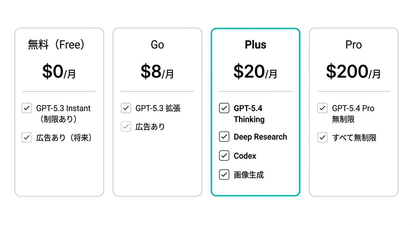 | Plus | $20 | 推論モデル・Deep Research・Codex・画像生成などフル活用 |