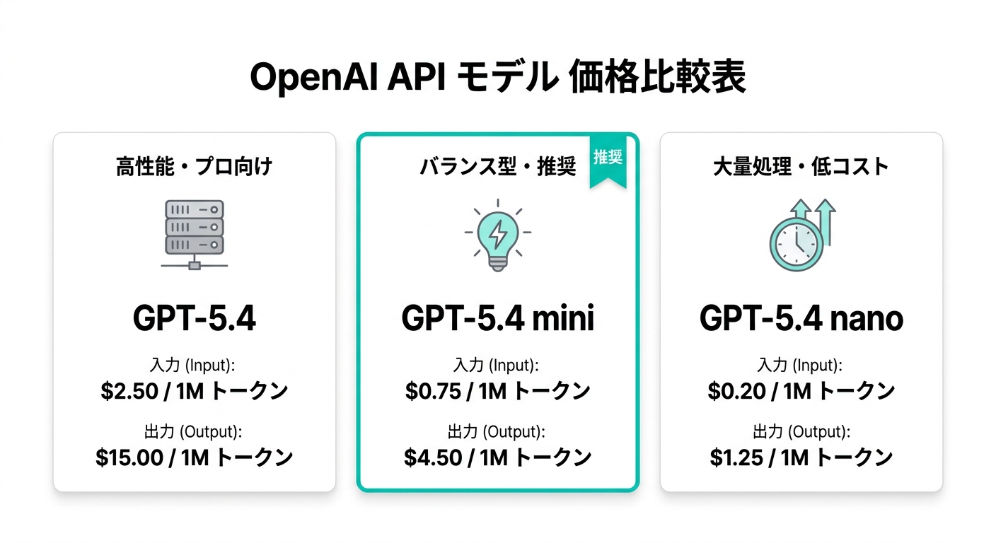 - 主なモデル: GPT-5.4(高性能)、GPT-5.4 mini(バランス)、GPT-5.4 nano(安価・大量処理)