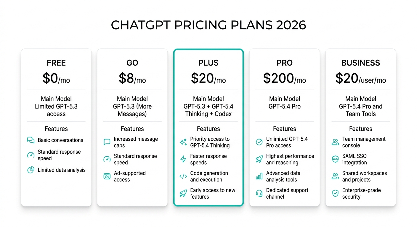 | Business | $20/人 | GPT-5.4 + ツール連携 | チーム向け、SAML SSO、管理機能 |
