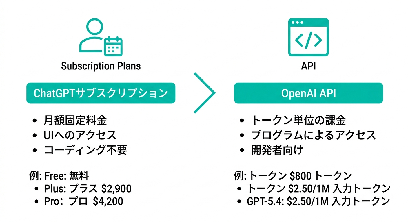 テキトー教師サブスク(Free/Go/Plus/Pro/Business)はChatGPTのUI(ブラウザやアプリ)を使って会話するものです。APIはOpenAIのプラットフォームから別途契約して、プログラムからChatGPTのモデルを呼び出す開発者向けのサービスです。