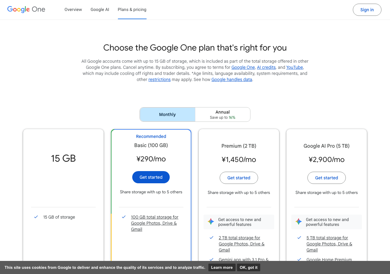 | 標準有料 | Plus | Google AI Pro($19.99/月、5TBストレージ付) |