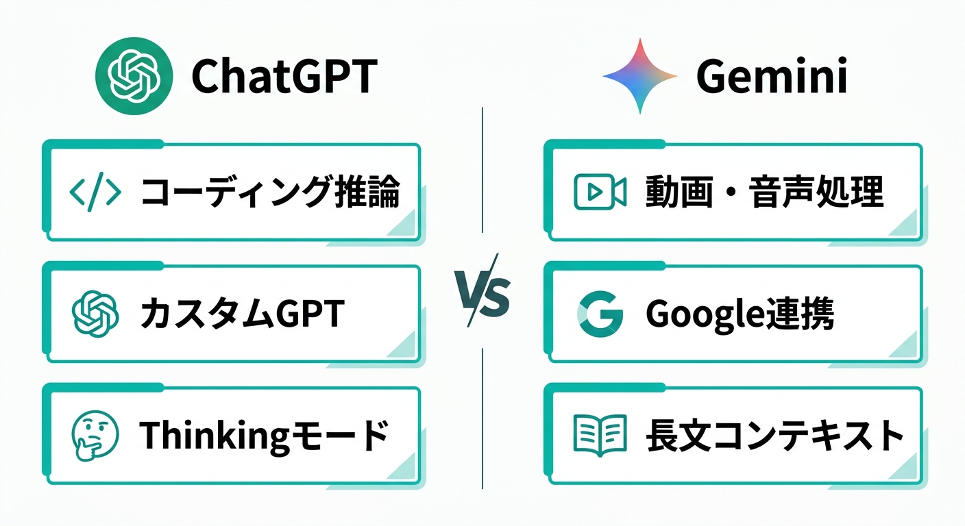 - ChatGPTの強み: Thinkingモードの深い推論、コーディング品質、エコシステム(カスタムGPT)