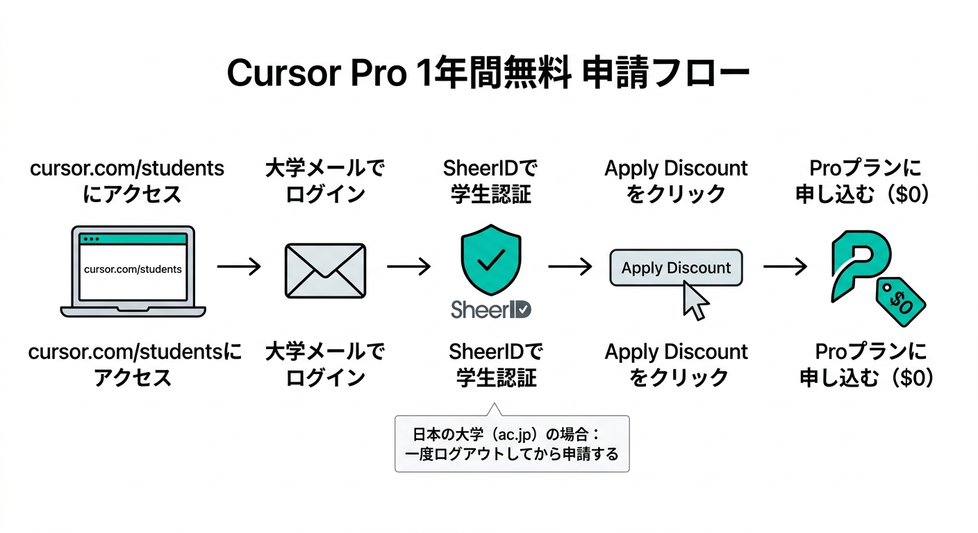 - Cursor公式サイトの学生ページ(cursor.com/students)にアクセスする