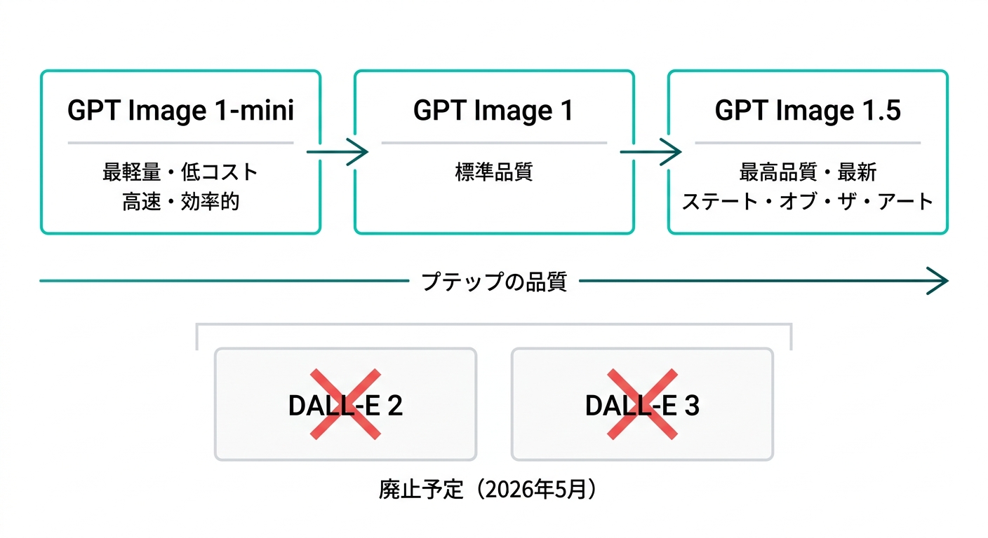 - 最新モデルはgpt-image-1.5(DALL·Eは2026年5月に廃止予定)