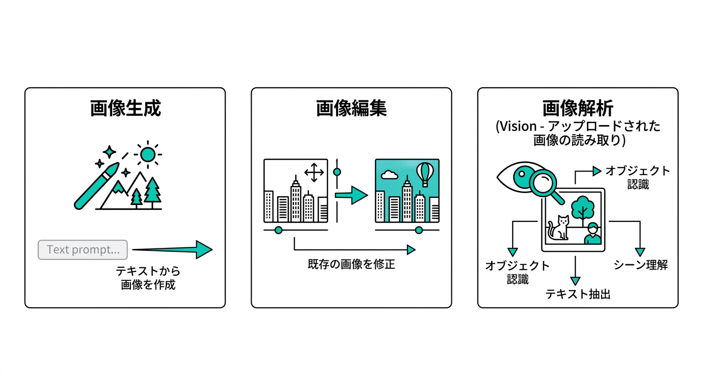 - 3つの機能を区別する:生成(Image Generation)・編集(Image Editing)・解析(Vision)