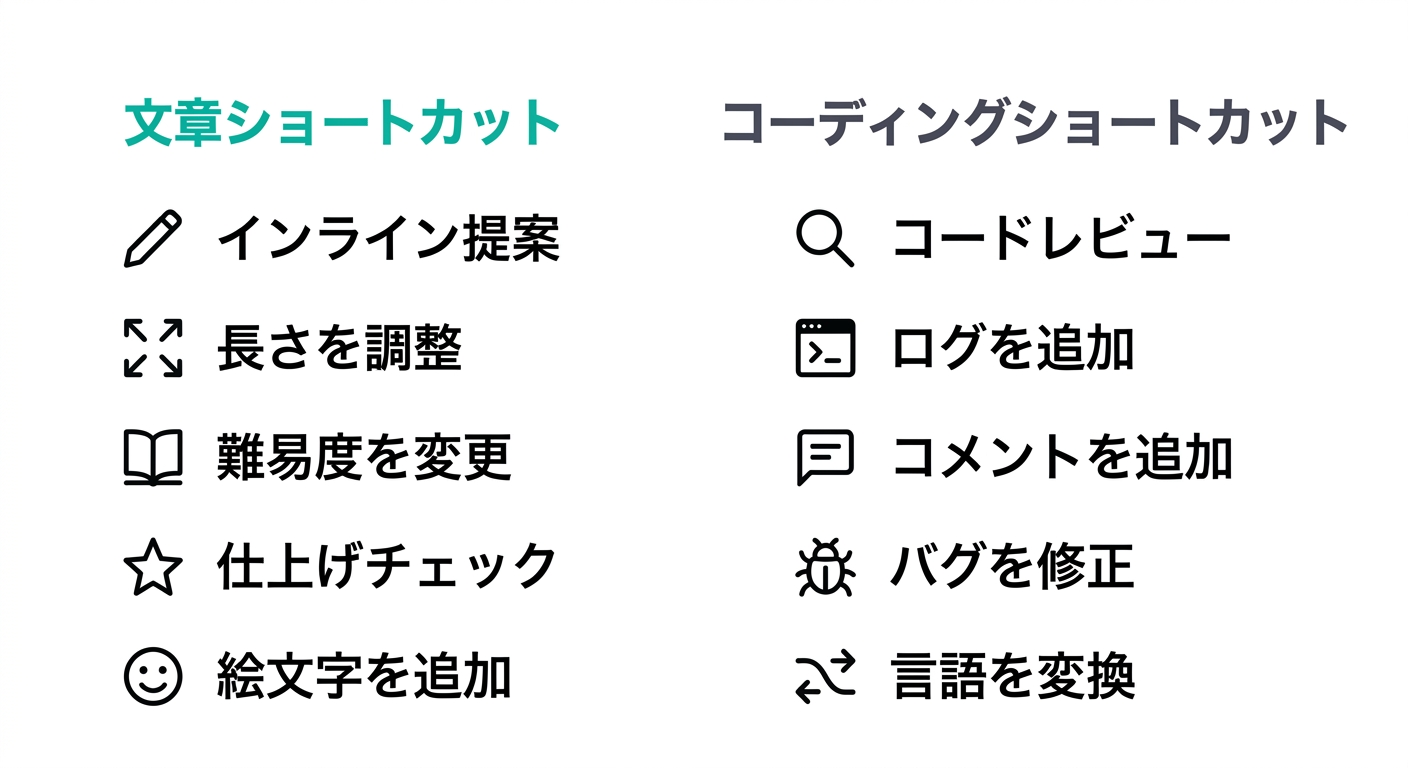 - 文章向けショートカット(長さ調整・読みやすさ変更・推敲等)とコーディング向けショートカット(バグ修正・ログ追加・言語変換等)がある
