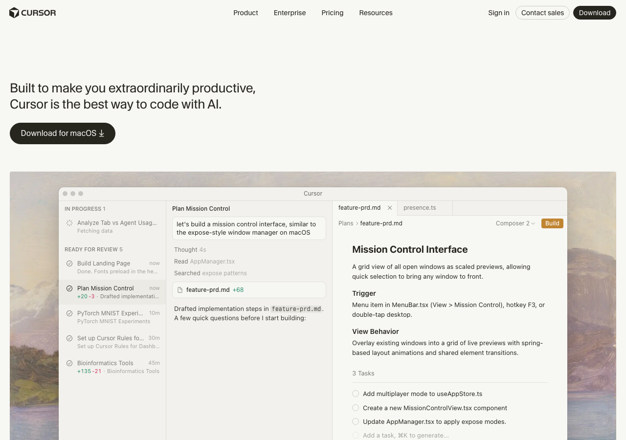 CursorはVS Codeのフォーク(派生製品)なので見た目・操作感はほぼ同じです。違いは「AIがエディタの深部まで統合されている」点で、コードベース全体をAIが理解した上でコード補完・マルチファイル編集・自律エージェント実行が使えます。