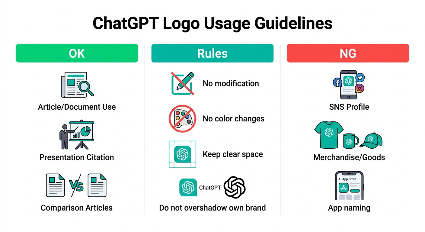 室谷いえ、ルールを守れば使えます。OpenAIのブランドガイドラインの使用条件をまとめると、こんな感じです。