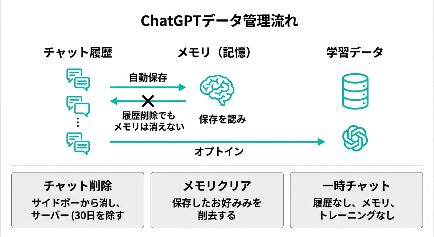 室谷つまり「学習には使わないけど、自分の画面には残る」っていう設定ですね。履歴そのものを残したくない場合は一時チャット、学習データへの利用だけ止めたい場合はこの設定、と使い分けるのがポイントです。