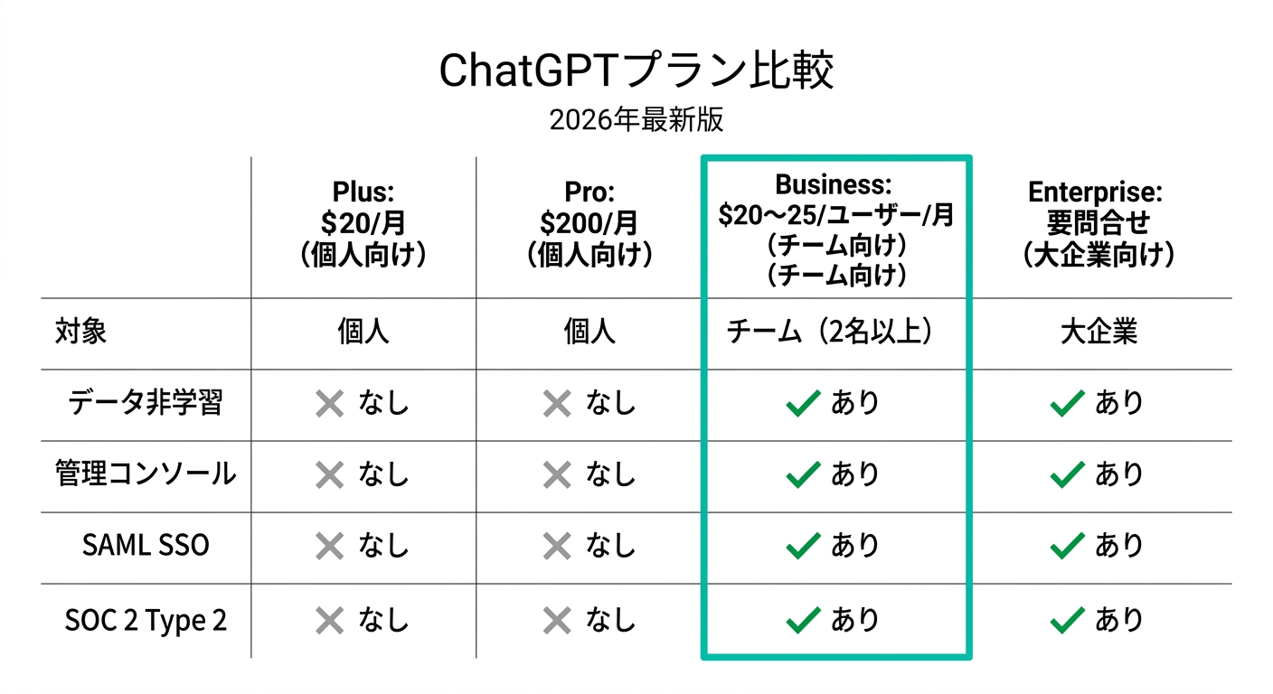 テキトー教師ただ個人事業主で外部パートナーと一緒に使いたいとか、そういうケースなら2人契約でBusiness選ぶメリットはあります。データ保護・SAML SSOなど企業ユースの機能が個人プランには含まれないので。