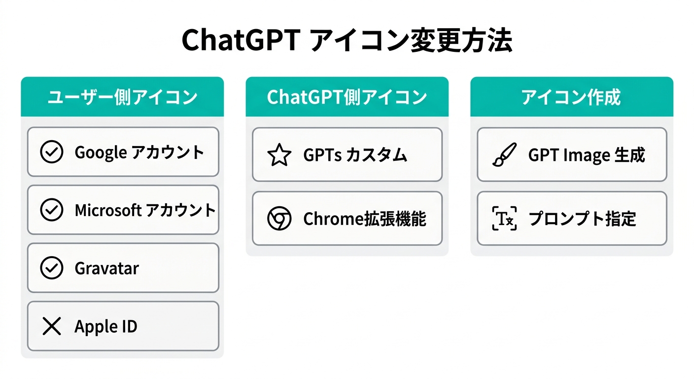 - ChatGPT側のアイコンは、GPTsでカスタムアイコンを設定するのが最も実用的