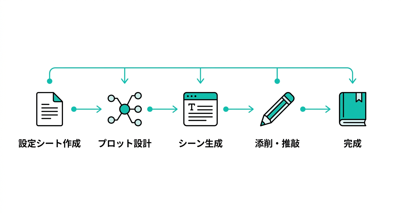 テキトー教師設定を固める、プロットを設計する、場面ごとに生成する、自分で編集・加筆する——このサイクルを回すことで、単純に「全部書かせる」よりも圧倒的に良い作品が生まれます。