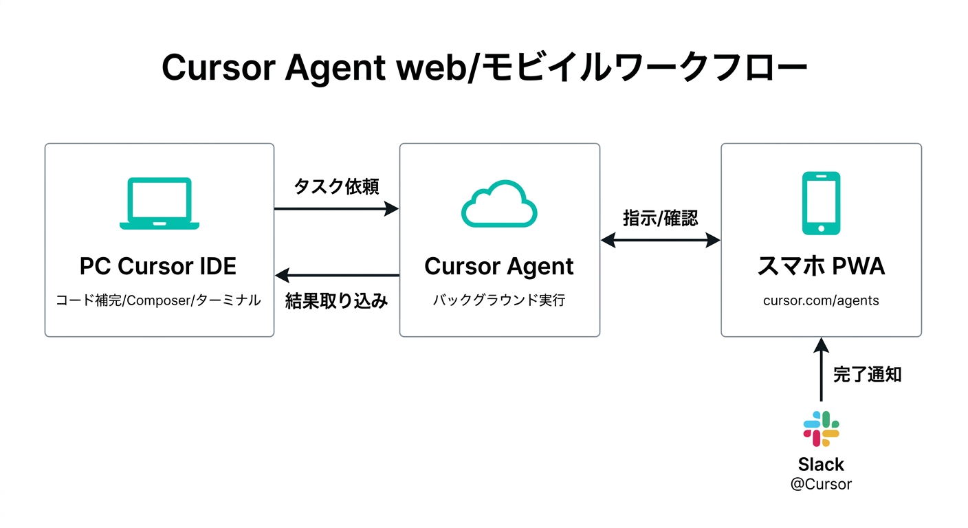 - スマホでできるのはCursor Agentへの指示・監視・フィードバック。IDE機能(コード補完・Composer)はスマホでは動かない
