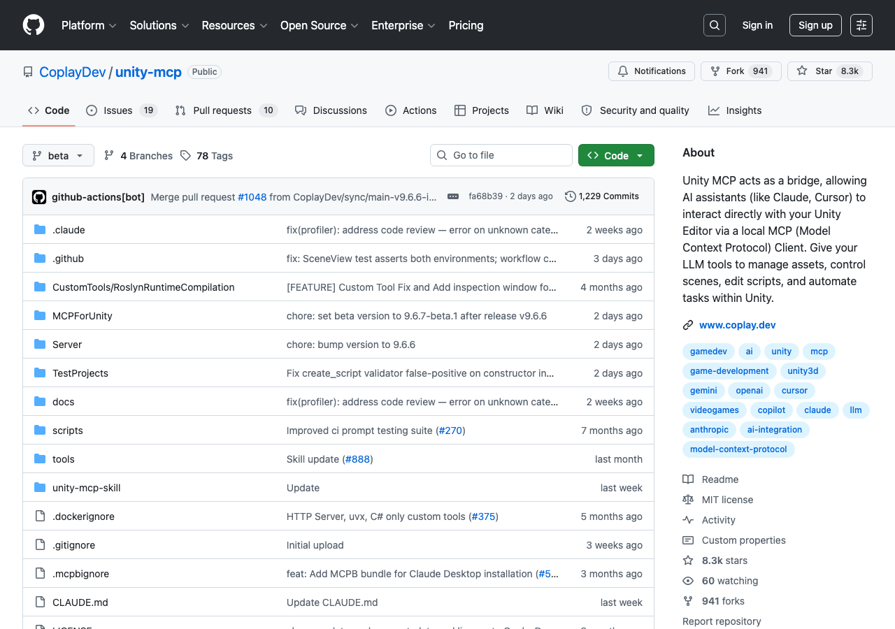 室谷使うのは「MCP for Unity」というオープンソースプロジェクトです。GitHubスターが8,300以上あって、CoplayというAI企業が開発・メンテナンスしています。