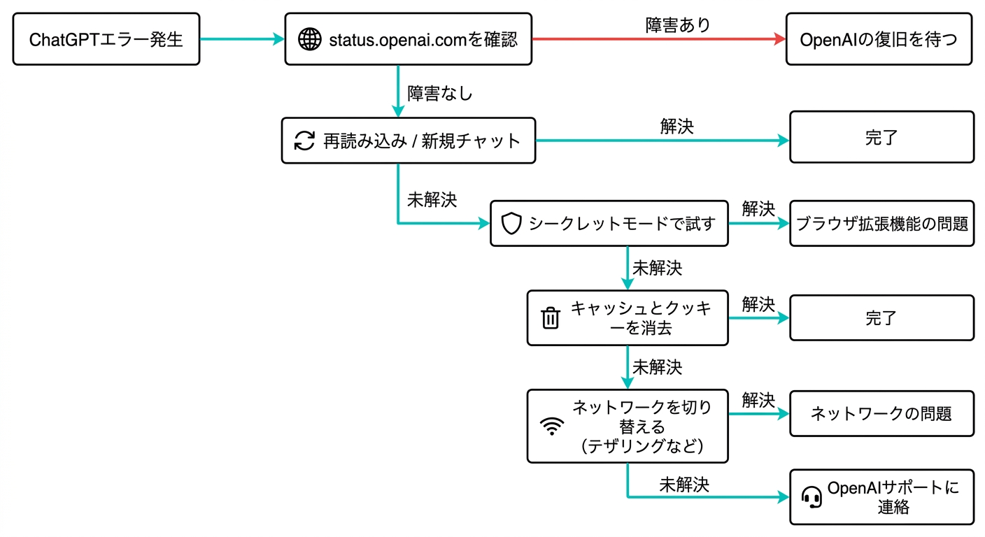 テキトー教師OpenAI側の障害なら待つしかない。自分の環境が原因なら、リロード→シークレットモード→キャッシュ削除の順に試す。