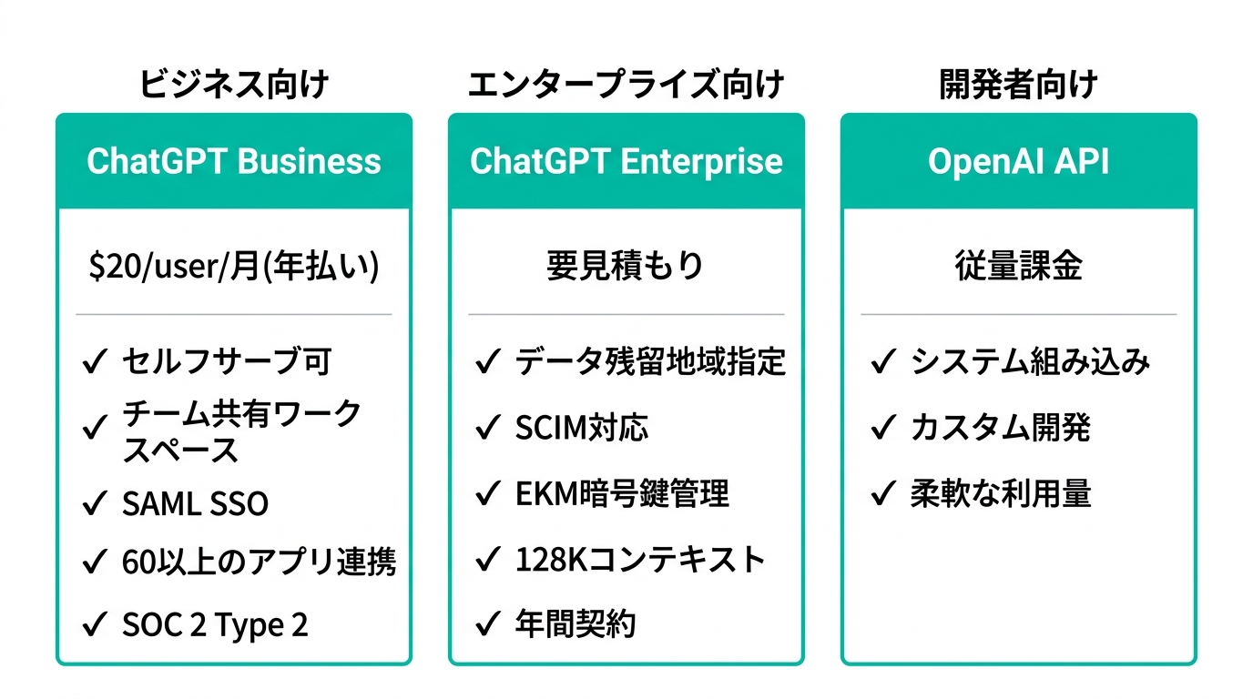 室谷そうですね。整理すると、ChatGPT Business、ChatGPT Enterprise、あとAPI(OpenAI API)の3択です。