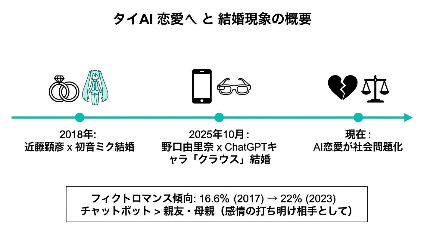 電通の調査ではチャットボットが感情の打ち明け相手として親友や母親を上回り、フィクトロマンス傾向は特に若年層で増加中です。