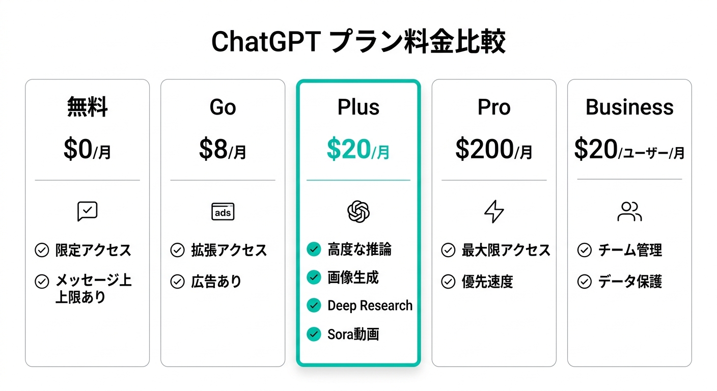 テキトー教師仕事で使うなら迷わずPlusを選んでください。$20/月で高度な推論モデル、画像生成、Deep Research、Codexが全部使えます。