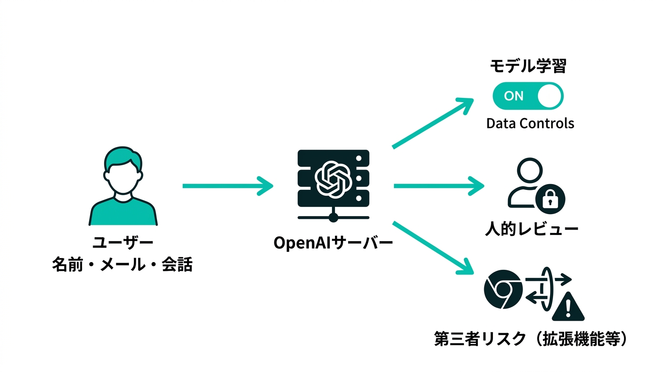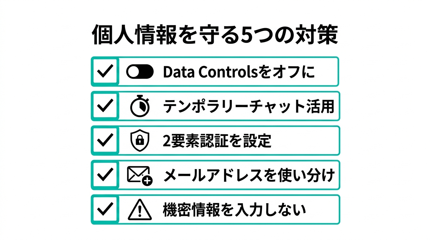 テキトー教師特にData Controlsで学習をオフにするのは最優先です。名前だけでなく、会話の中で入力した全ての情報に対するリスクを下げられますから。