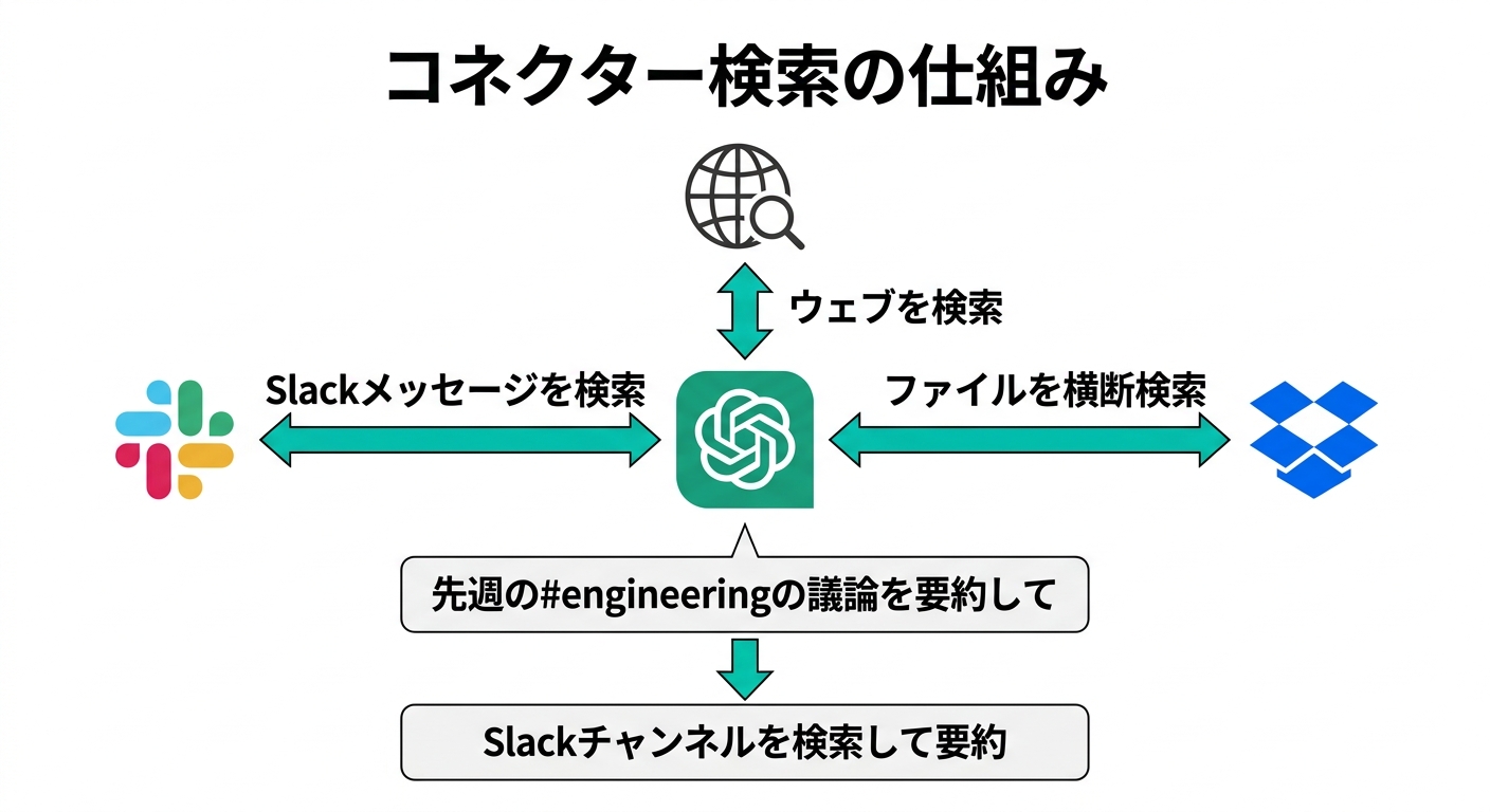 テキトー教師「chatgpt 社内 文書 検索」という需要も大きいですよね。先ほど話したコネクター検索(SlackやDropbox連携)がまさにその用途に使えます。