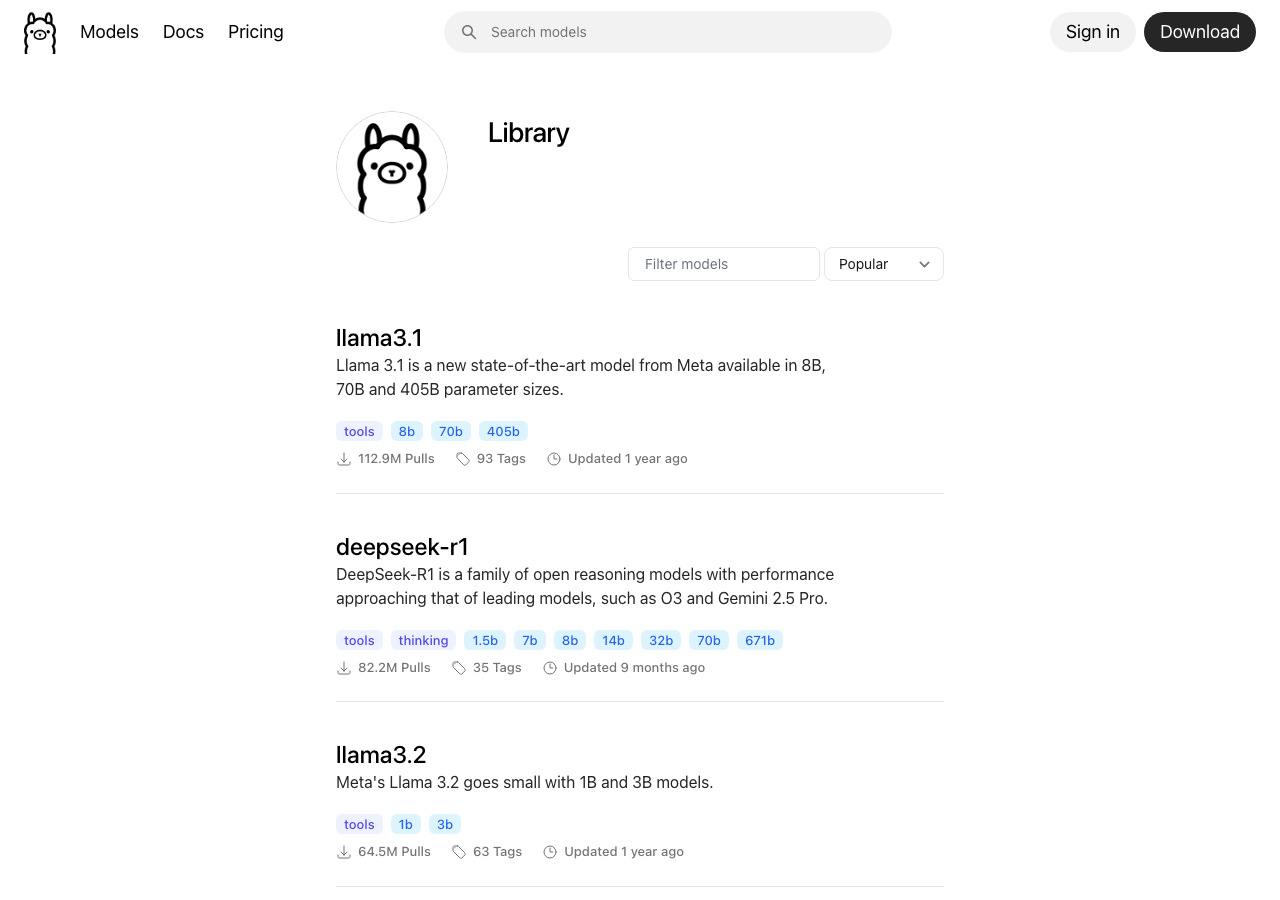 室谷Ollamaで使えるモデルはに一覧があります。2026年時点で人気上位はこんな感じです。