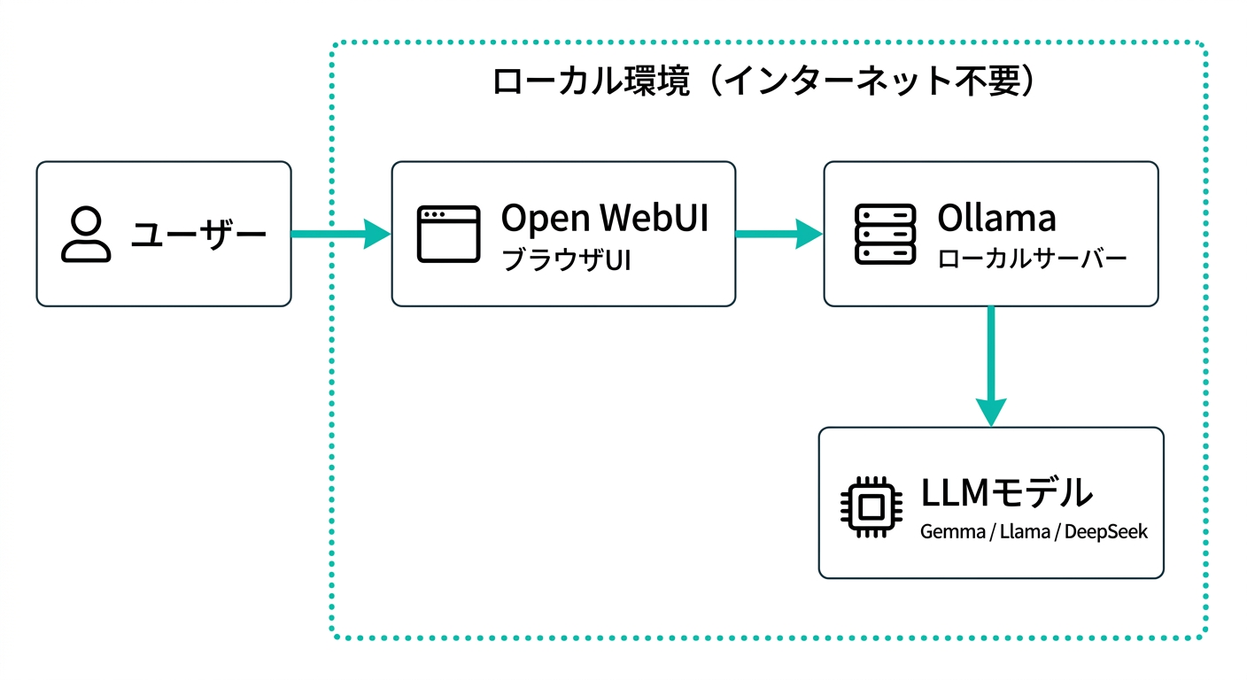 室谷社内文書を安全にAIに読ませたい、でも外部に出したくない、という場合は、Open WebUI + Ollamaのローカル構成がそれに応えるソリューションになります。