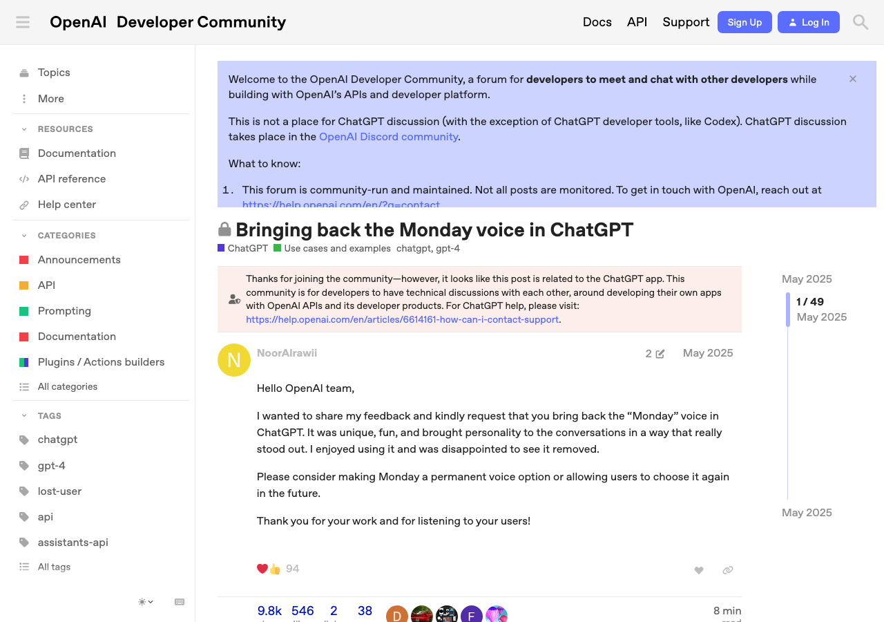 テキトー教師OpenAIの開発者コミュニティでは「Monday voice assistant is gone(Mondayの音声アシスタントがいなくなった)」「Please return Monday voice(Mondayの声を返して)」というスレッドが複数立ち上がるほどの反響でした。