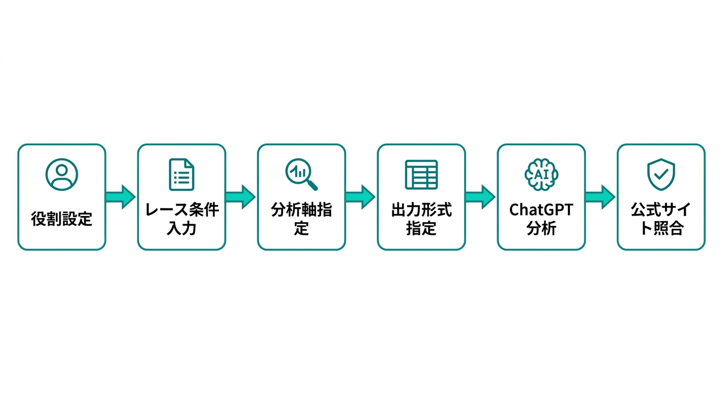 テキトー教師手順としては、ChatGPTにログイン→役割設定(プロの競馬アナリストとして分析してほしい)→レース条件と分析軸の入力→出力形式の指定→結果の出力→公式サイトで情報照合、という流れです。本記事の「的中率と回収率を高めるプロンプト」セクションを参考にしてください。