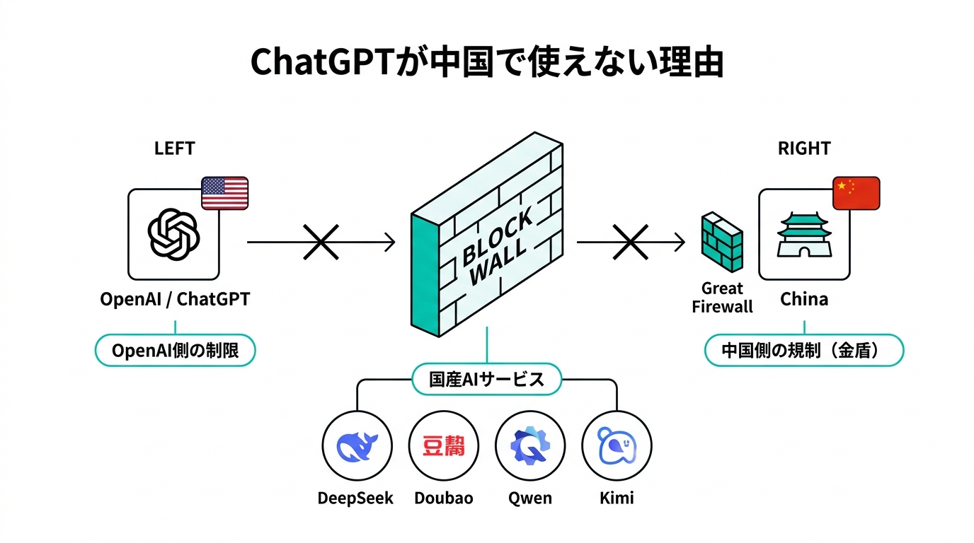 テキトー教師じゃあ、そもそもなぜ中国ではChatGPTが使えないのか、整理しましょう。これ、単純に「中国政府が禁止した」だけじゃないんですよね。