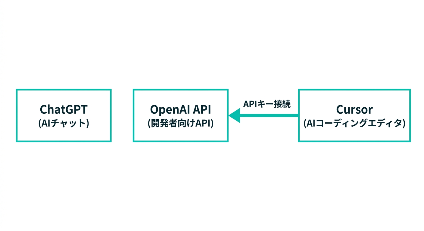- CursorとChatGPTは別サービス。連携とは「OpenAI APIキーをCursorに設定する」こと