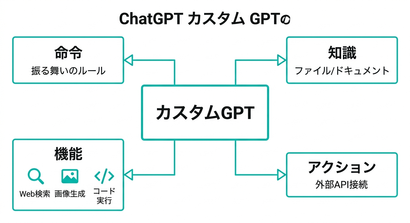 テキトー教師具体的に言うと、GPTsには大きく3つの要素があります。「命令(Instructions)」「知識(Knowledge)」「機能(Capabilities)」の3つです。