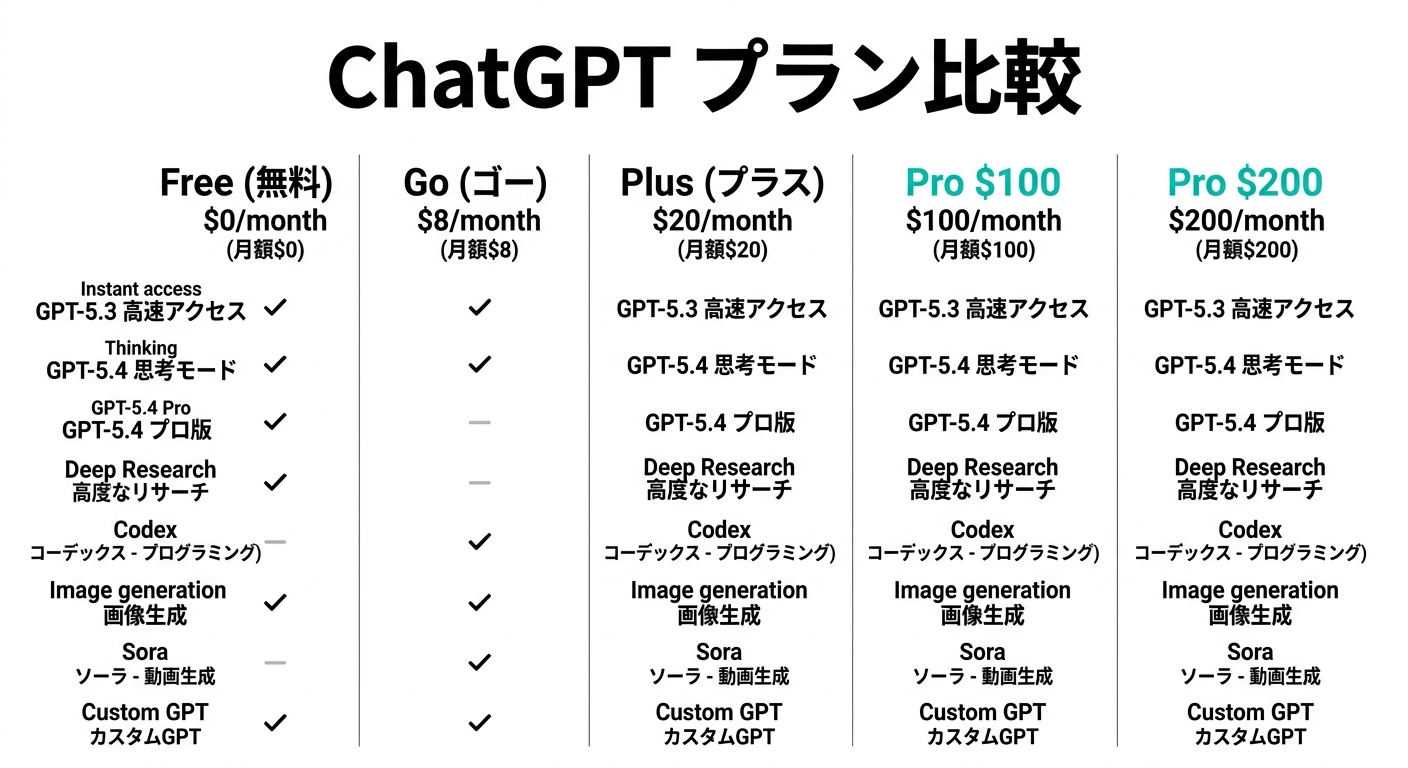 - 仕事でChatGPTを使うなら最低でもPlus($20)。無料版の制限は仕事用途には厳しい