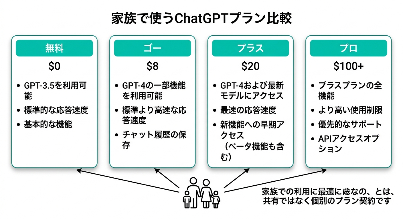 - ChatGPTにファミリープランは2026年4月時点で存在しない