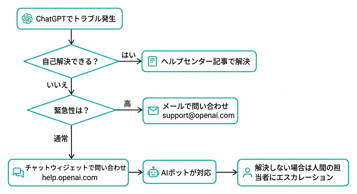 | 請求・返金・プラン変更 | チャットウィジェット → 解決しなければ support@openai.com |