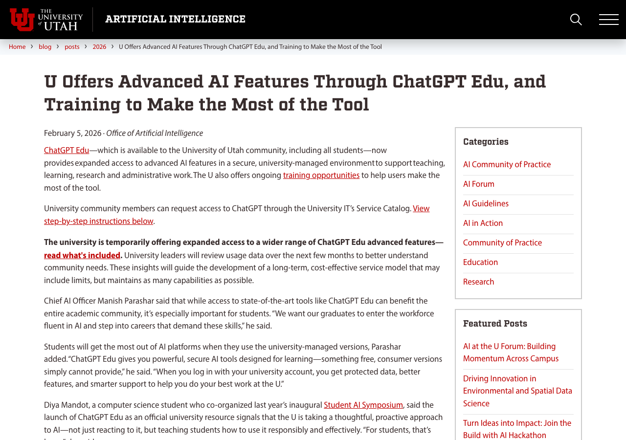 テキトー教師University of Utahは2026年2月にChatGPT Eduを全学導入していて、学生を含む大学コミュニティ全体に開放しています。初期フェーズでは機能を広く開放して利用データを収集し、長期的なコスト効果の高いサービスモデルを構築する方針だそうです。