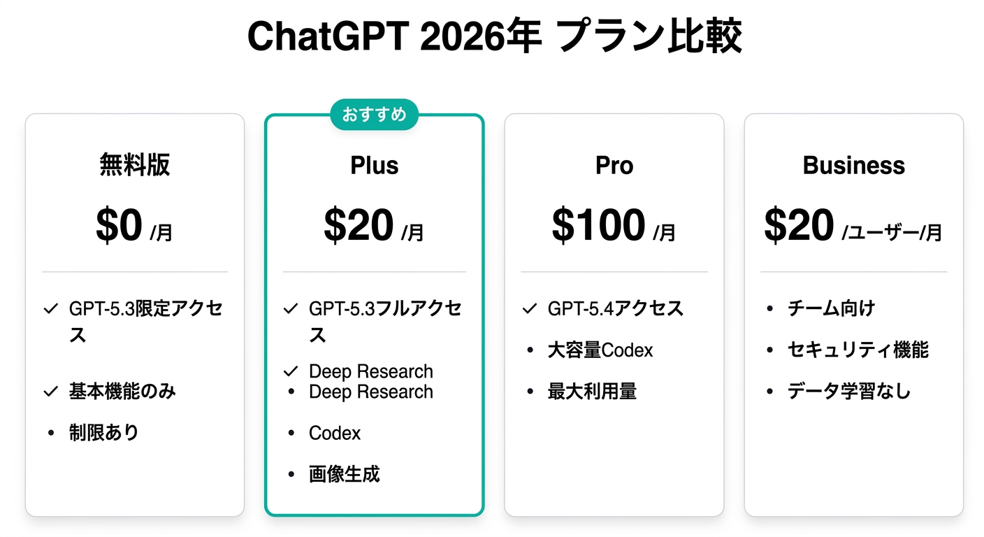 - 毎日使いたい個人: Plus($20)が基本。Deep Research・Codex・画像生成が全部使える
