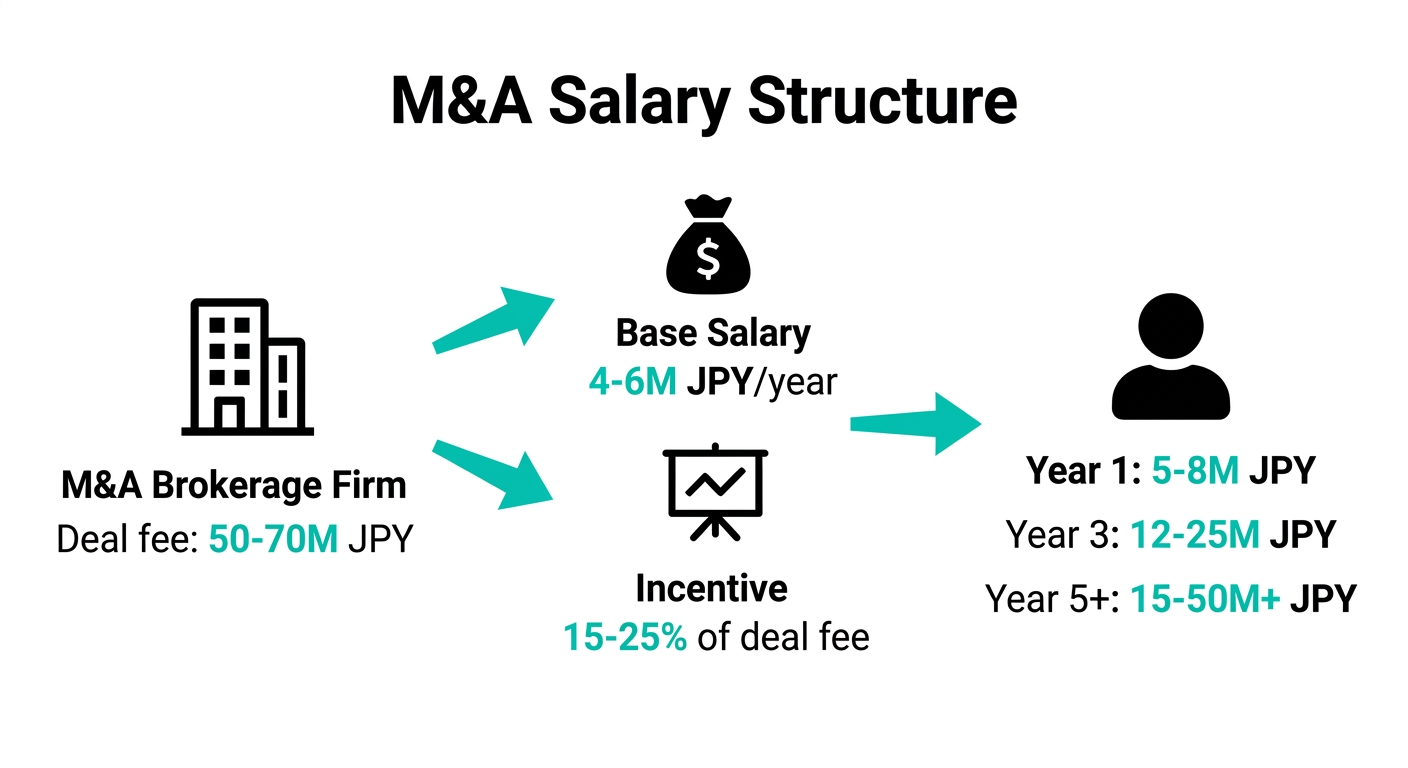 室谷M&A仲介の給料は基本的に「基本給 + インセンティブ」の二本立てです。会社によって比率が全然違うんですが、大まかに整理するとこうなります。