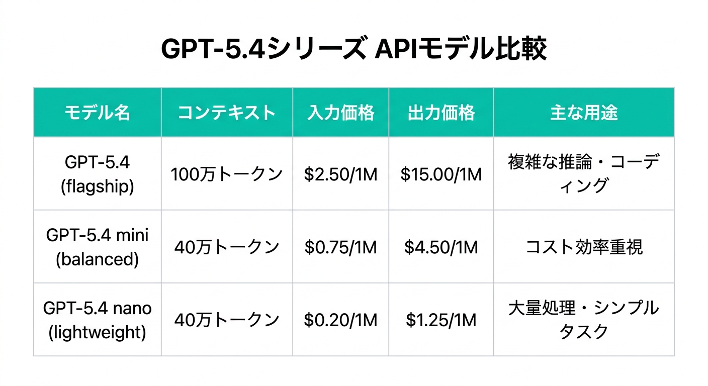 テキトー教師APIについては、開発者向けに3つのGPT-5.4モデルが用意されています。まとめるとこうなります。