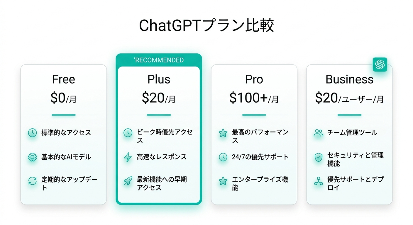 | Business | $20/ユーザー | チーム・中小企業 | GPT-5.4 無制限メッセージ |
