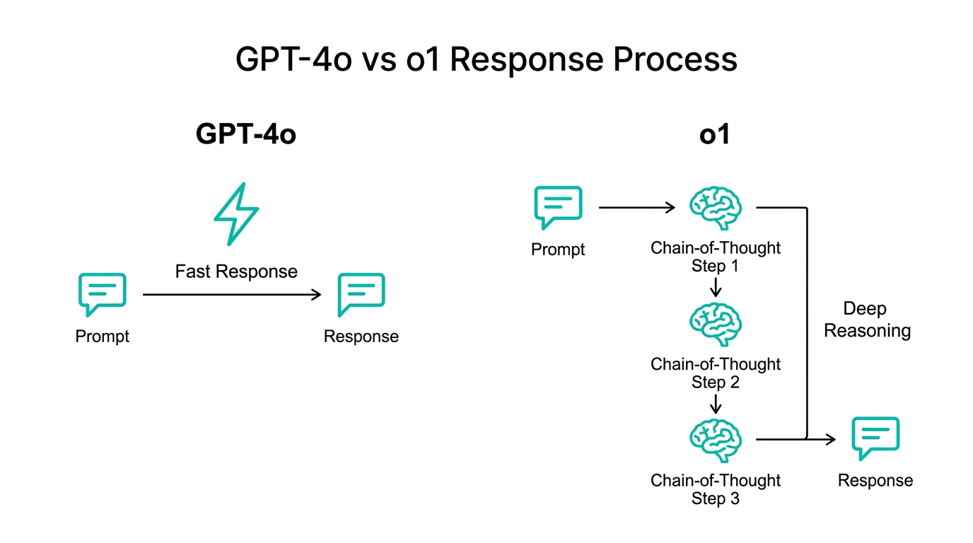 テキトー教師最大の違いは「思考プロセスの有無」ですね。GPT-4oはプロンプトを受け取ったら即座に回答を生成しますが、o1は回答前に内部で推論ステップを実行します。