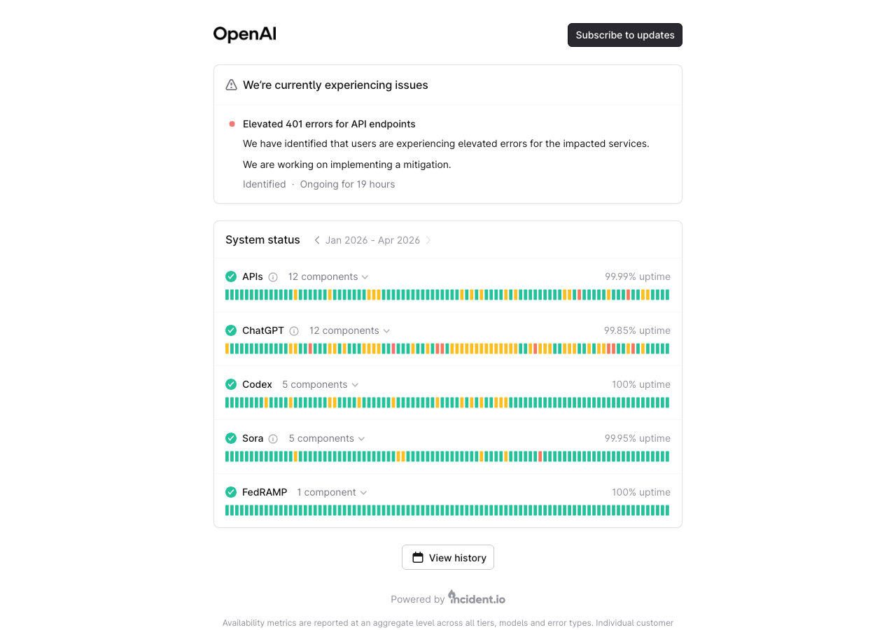 室谷OpenAIのを見ると、ChatGPTの稼働率は99.85%と公表されてます。つまり0.15%はダウンや遅延が発生してるわけで、それが集中するのがピーク時間帯なんですよね。