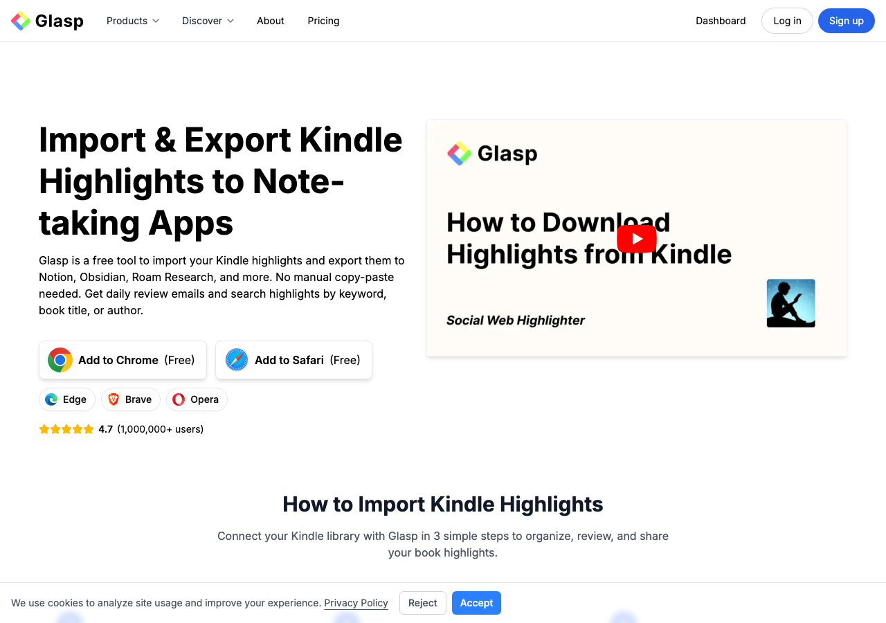 テキトー教師Glaspはブラウザ拡張機能で、Kindle Cloud Readerと連携してハイライトを一括エクスポートできます。エクスポート形式もTXT、CSV、Markdownに対応していて、NotionやObsidianにも直接送れるんですよ。