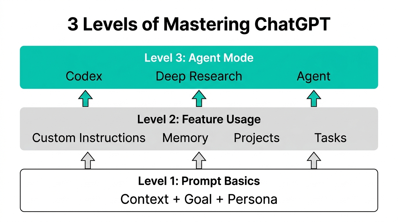 - 機能の活用(プランに応じて段階的に): カスタム指示、メモリ、Projects、Tasks、Deep Research、エージェントモード、Codex