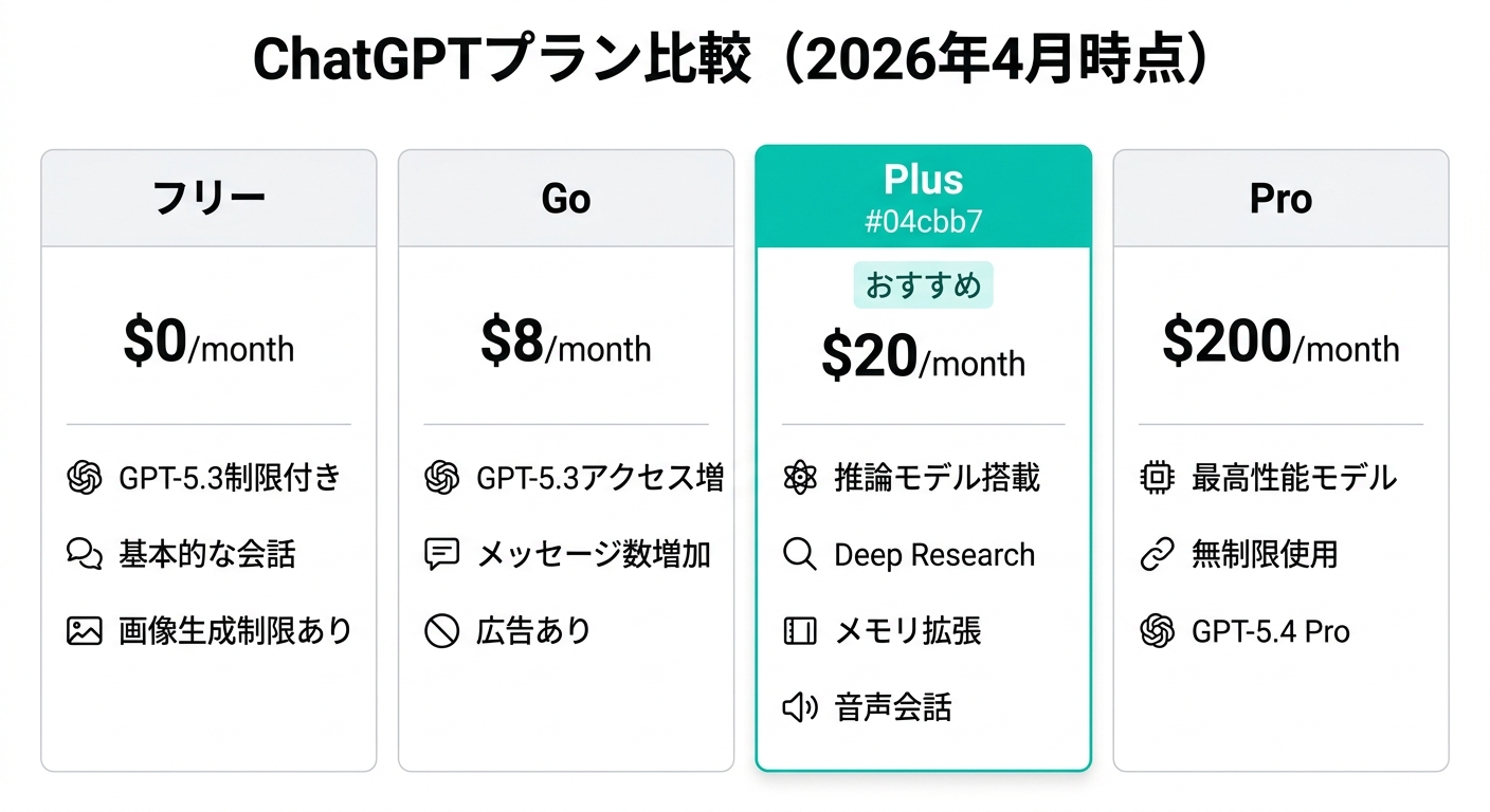 | Free | $0 | GPT-5.3に制限付きアクセス、画像生成制限あり |