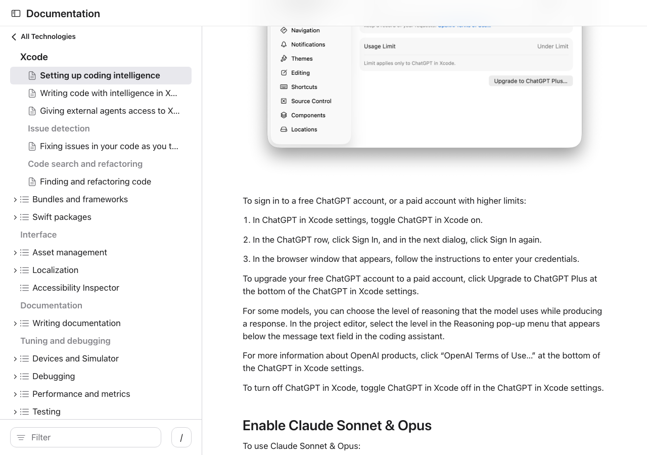 - ChatGPT / Claude(Chat機能): コーディングアシスタントパネルでの会話形式の支援。プロジェクトコンテキスト付きで質問できる。サーバーにデータが送信される。Xcode 26から。